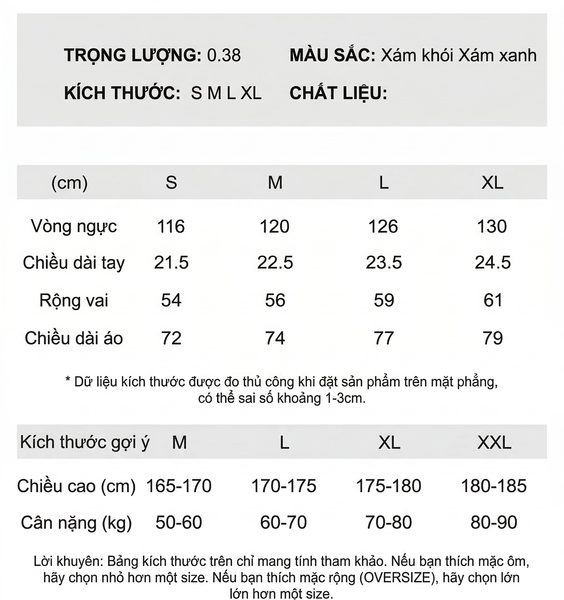 BẢNG SIZE CHI TIẾT MẪU